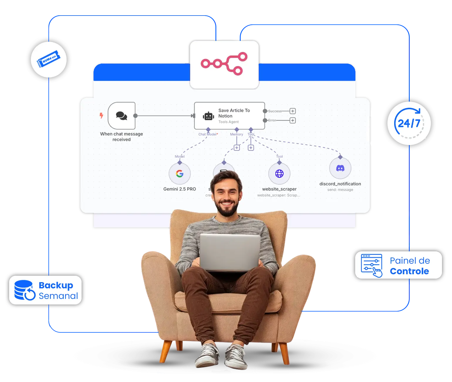 Hospede seus fluxos N8N em servidores ultrarrápidos com SSD NVMe, acesso root completo, suporte humano 24/7 e 99,95% de uptime
